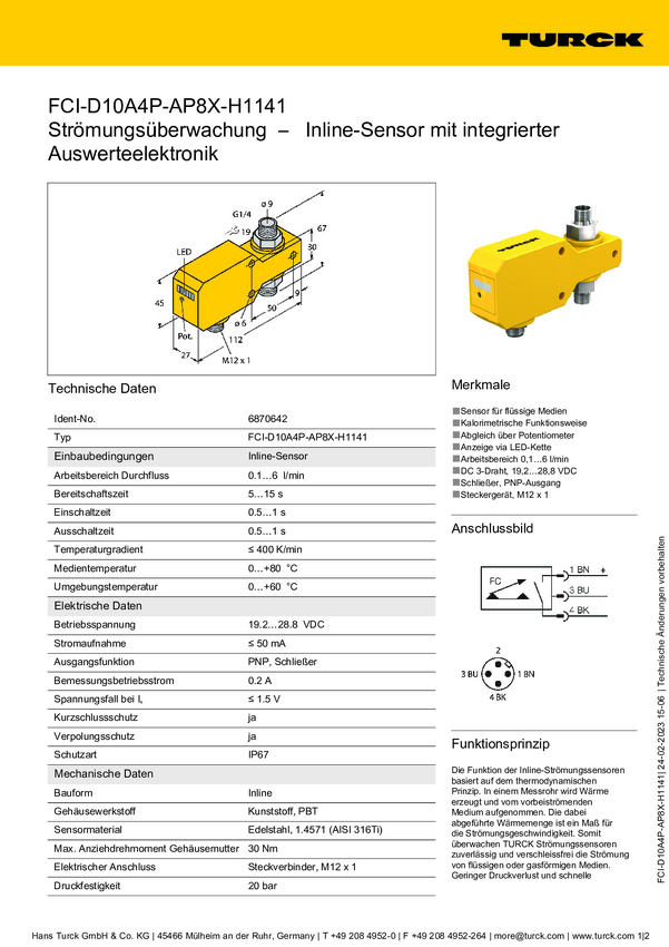 6870642 Turck 6870642 Czujnik liniowy FCI-D10A4P-AP8X-H1141, 19.2 - 28.8 V/DC,...