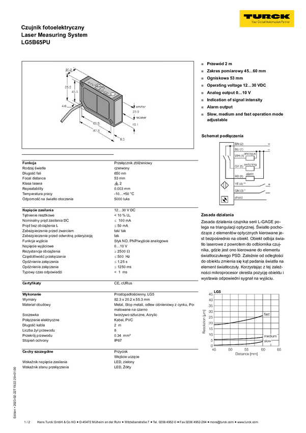 Turck Czujnik odległości PNP, Zamykający LG5B65PU