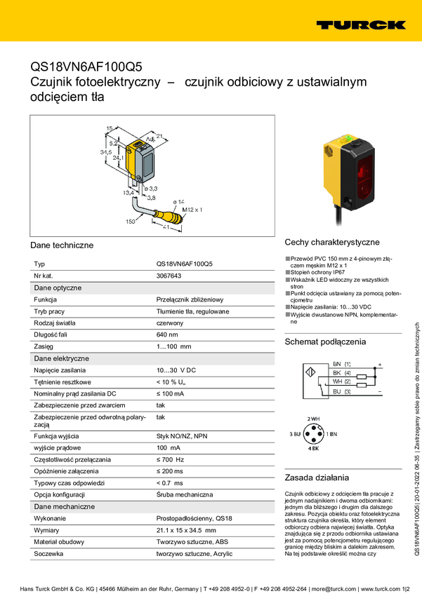 3067643 Czujnik dyfuzyjny Turck QS18VN6AF100Q5 3067643 1 szt.