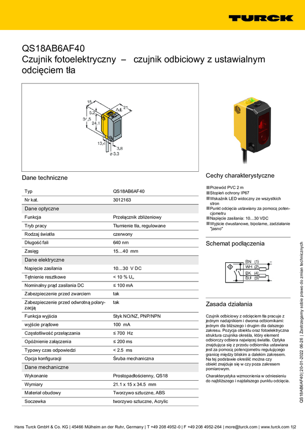 3012163 Czujnik dyfuzyjny Turck QS18AB6AF40 3012163 1 szt.