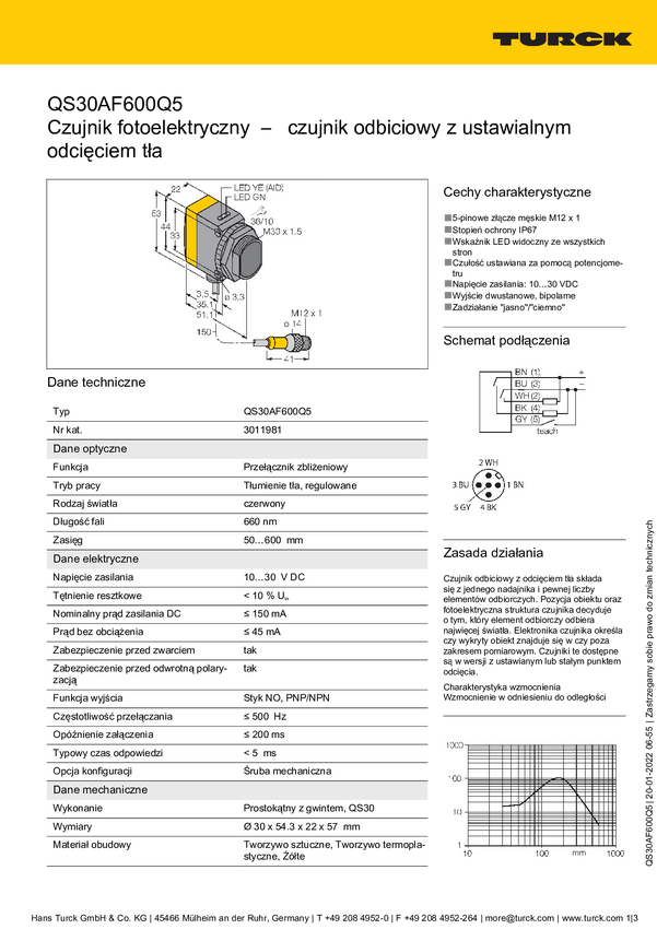 3011981 Czujnik dyfuzyjny Turck QS30AF600Q5 3011981 1 szt.
