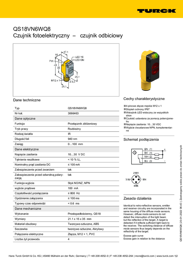 3066463 Czujnik dyfuzyjny Turck QS18VN6WQ8 3066463 1 szt.