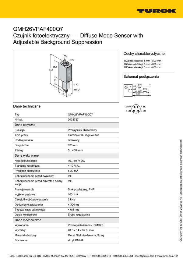 3028787 Czujnik dyfuzyjny Turck QMH26VPAF400Q7 3028787 1 szt.