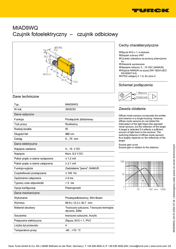 3035233 Czujnik dyfuzyjny Turck MIAD9WQ 3035233 przełączanie światła 1 szt.