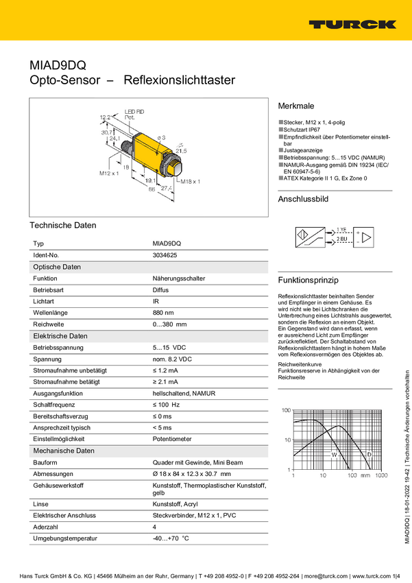3034625 Czujnik dyfuzyjny Turck MIAD9DQ 3034625 przełączanie światła 1 szt.