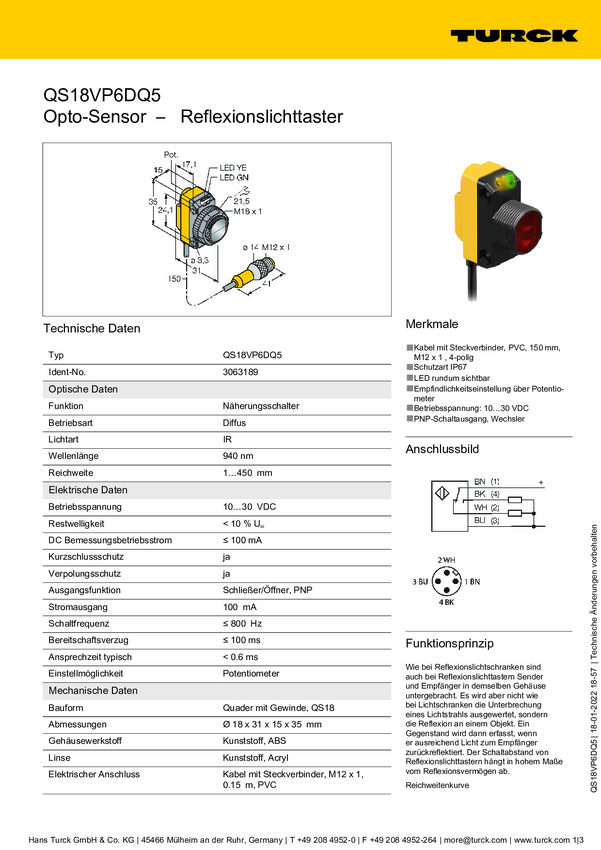 3063189 Czujnik dyfuzyjny Turck QS18VP6DQ5 3063189 1 szt.