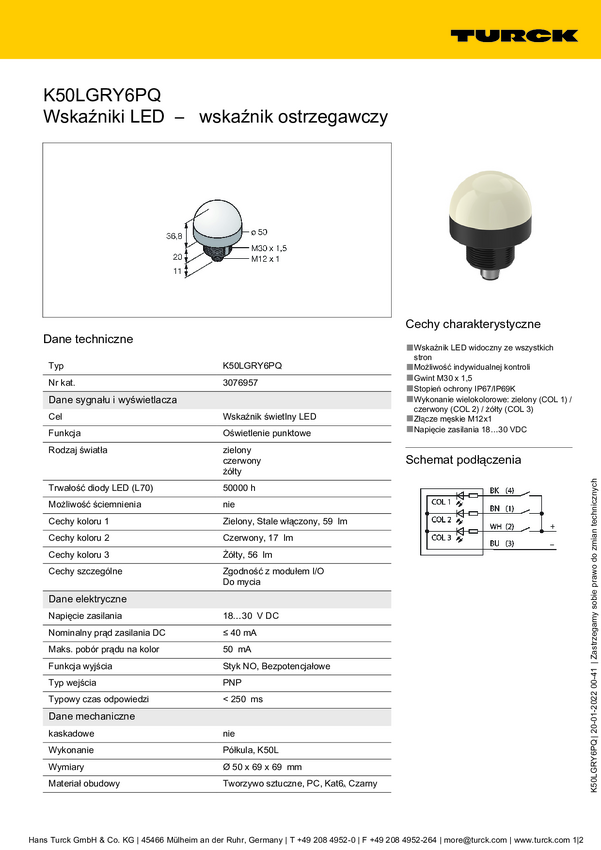 3076957 Lampa okrągła Turck K50LGRY6PQ światło ciągłe