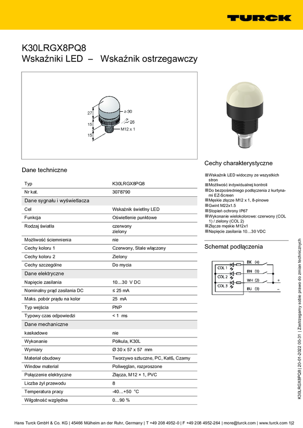 Lampa okrągła Turck K30LRGX8PQ8 światło ciągłe