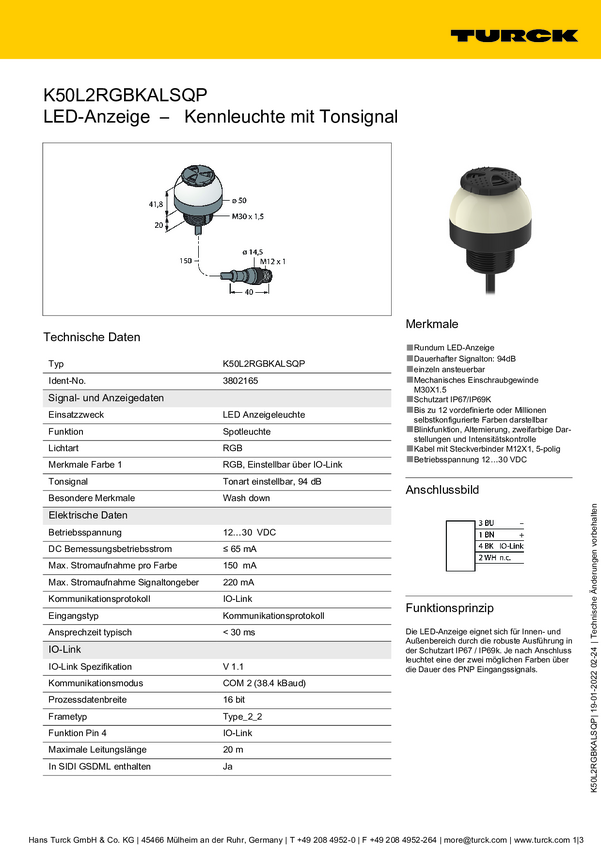 Lampa okrągła Turck K50L2RGBKALSQP 94 dB