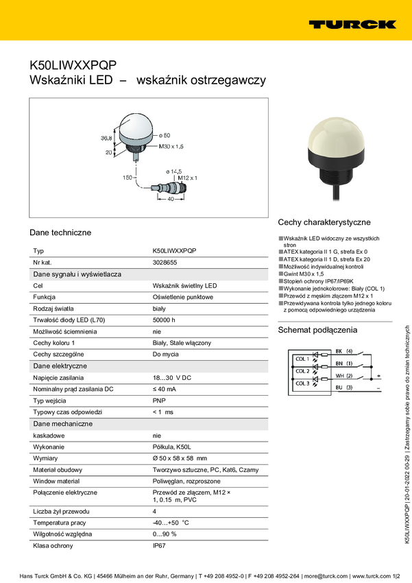 Lampa okrągła Turck K50LIWXXPQP 3028655 1 szt.