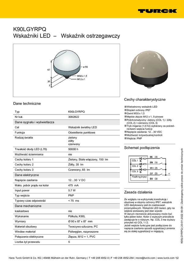 Lampa okrągła Turck K90LGYRPQ światło ciągłe