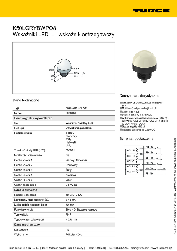 3076959 Lampa okrągła Turck K50LGRYBWPQ8 światło ciągłe