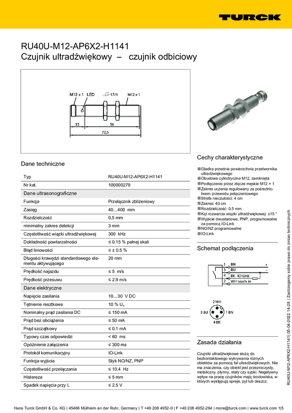 100000279 Przycisk refleksyjny, ultradźwękowy Turck 100000279 1 szt.