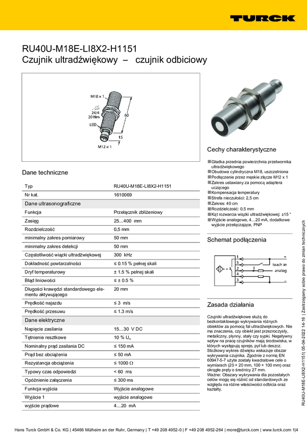 1610069 Przycisk refleksyjny, ultradźwękowy Turck 1610069 1 szt.
