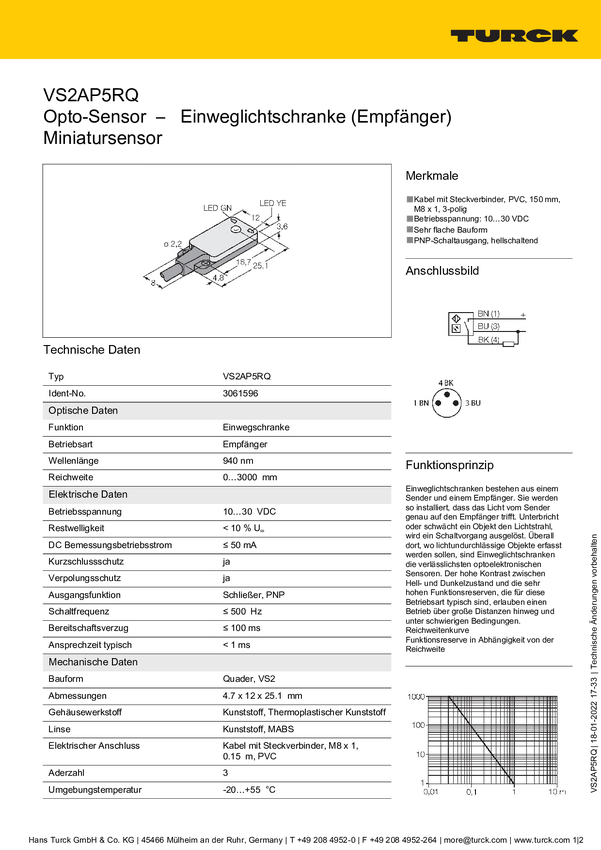 Bezzwrotny czujnik fotoelektryczny Turck VS2AP5RQ 3061596 1 szt.