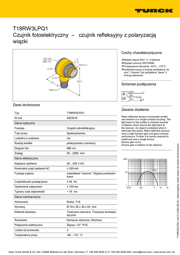 3033419 Fotokomórka odbiciowa Turck T18RW3LPQ1 3033419 1 szt.