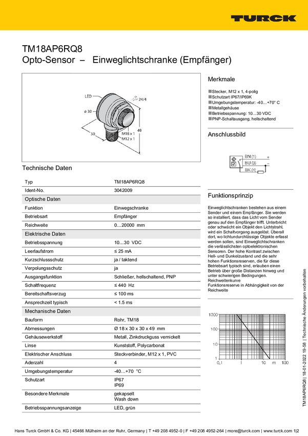 3042009 Bezzwrotny czujnik fotoelektryczny Turck TM18AP6RQ8 3042009 1 szt.