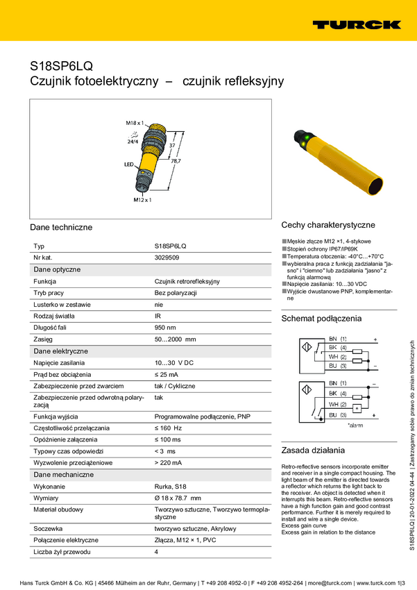3029509 Fotokomórka odbiciowa Turck S18SP6LQ 3029509 1 szt.