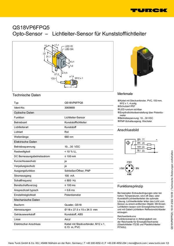 3069869 Czujnik światłowodowy Turck QS18VP6FPQ5 3069869 1 szt.