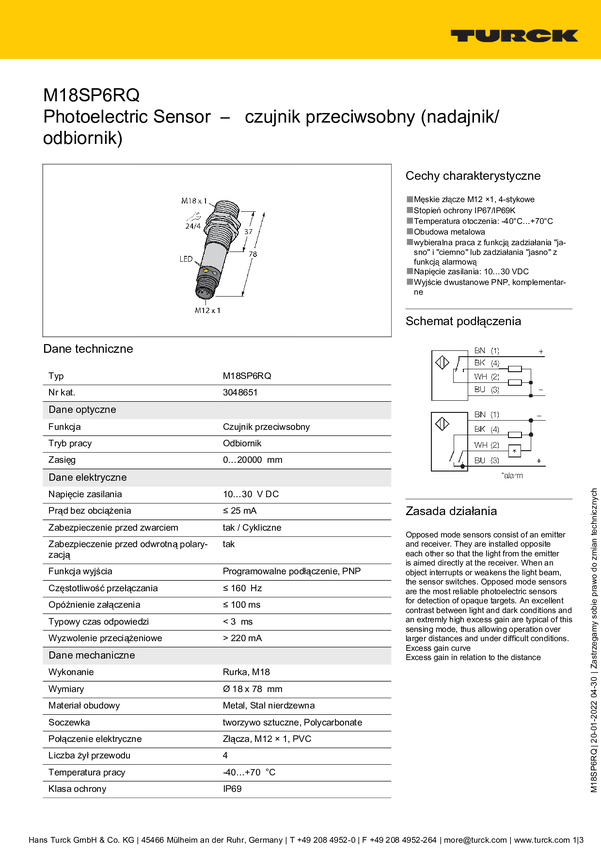 3048651 Bezzwrotny czujnik fotoelektryczny Turck M18SP6RQ 3048651 1 szt.
