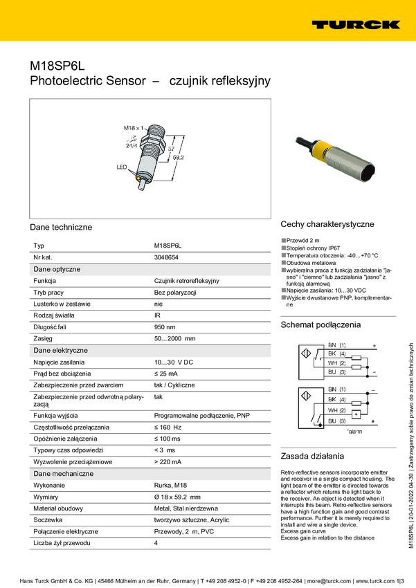 3048654 Fotokomórka odbiciowa Turck M18SP6L 3048654 1 szt.