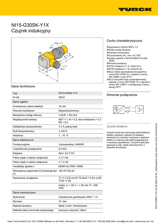 40221 Turck Czujnik indukcyjny nie podtynkowy NAMUR NI15-G30SK-Y1X