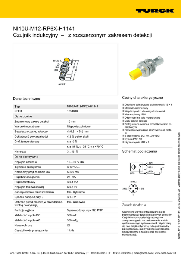 1634848 Turck Czujnik indukcyjny nie podtynkowy PNP, Otwierający NI10U-M12-RP6X-H11...