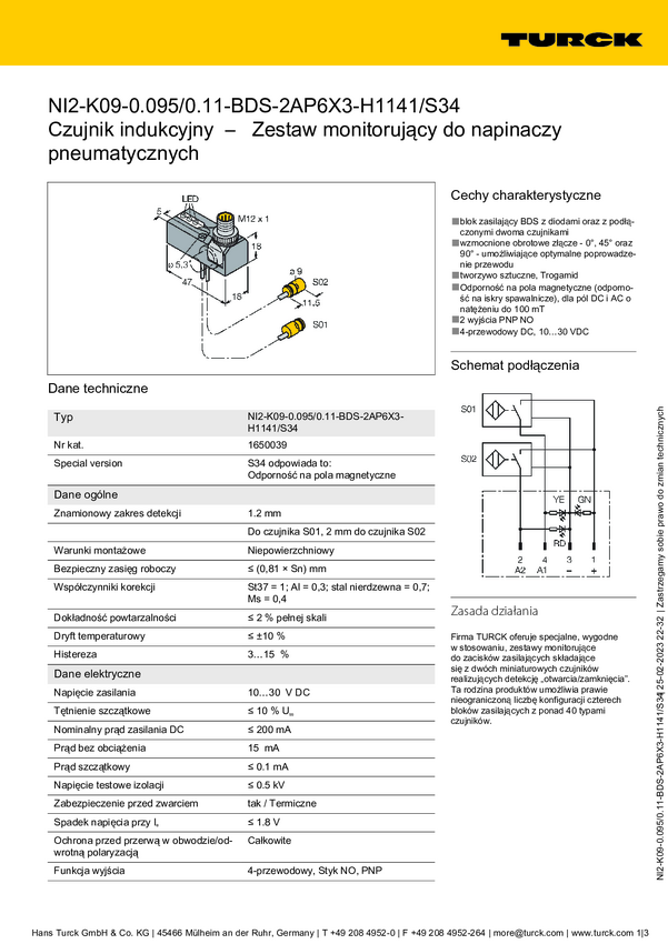 1650039 Turck Czujnik indukcyjny nie podtynkowy PNP, Zamykający NI2-K09-0,095/0...