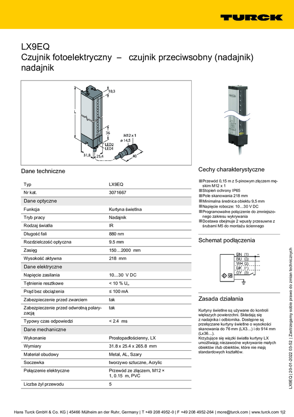3071667 Turck Bezzwrotny czujnik fotoelektryczny LX9EQ Wysokość ochronna 218 mm