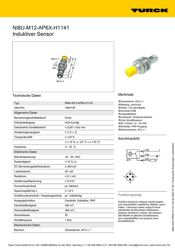 1644140 Turck Czujnik indukcyjny nie podtynkowy PNP, Zamykający NI8U-M12-AP6X-H1141