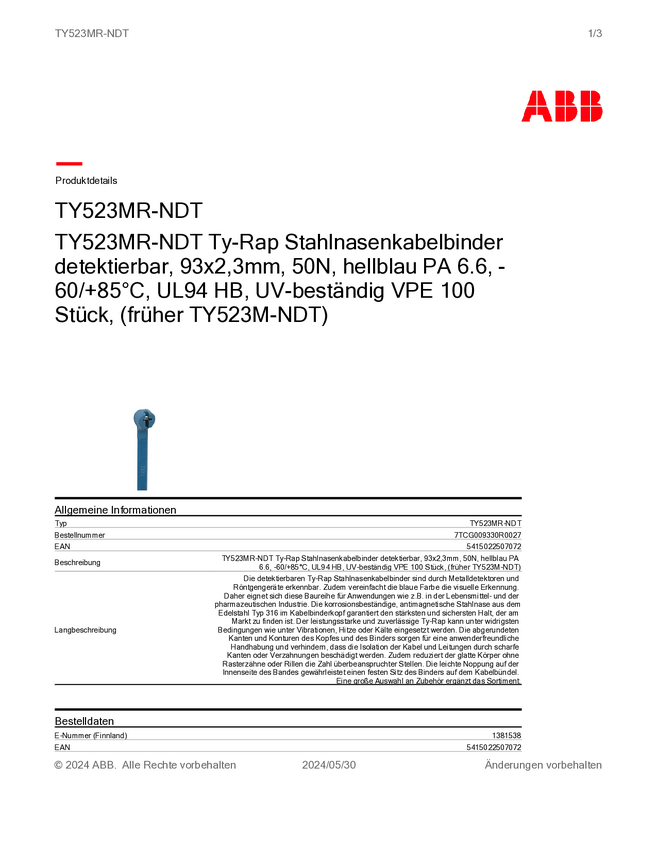 Opaska kablowa ABB TY523MR-NDT 7TCG009330R0027, 92 mm, tworzywo sztuczne, 1 szt.