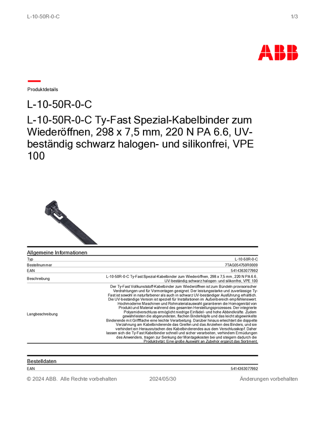 Opaska kablowa ABB L-10-50R-0-C 7TAG054750R0009, 302 mm, tworzywo sztuczne, 1 szt.