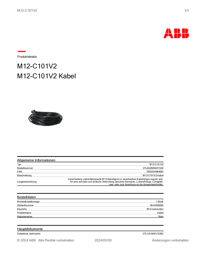 ABB 2TLA020056R1500 Kabel połączeniowy czujnika/aktuatora M12-C101V2, piny: 5, 10 m, 1 szt.