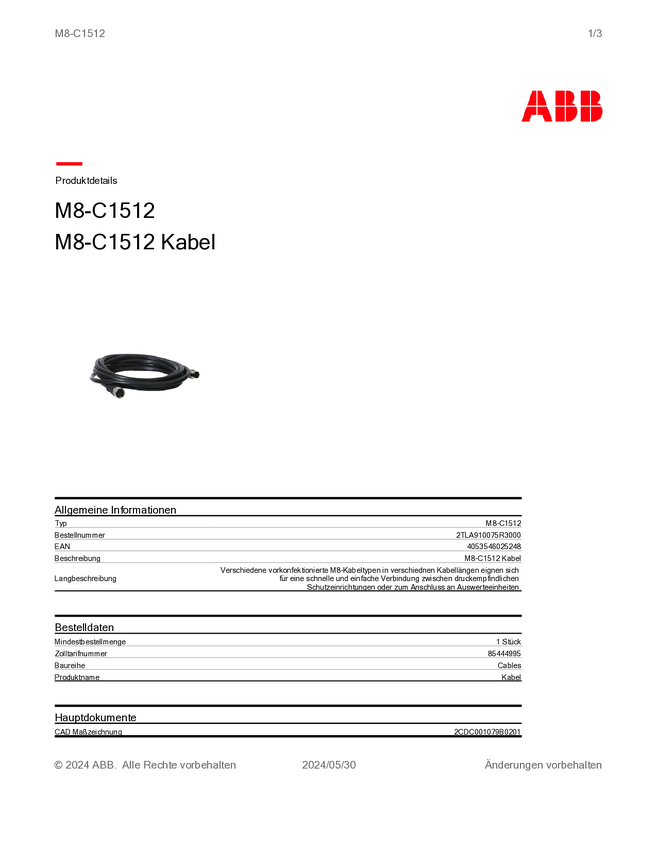 ABB 2TLA910075R3000 Kabel połączeniowy czujnika/aktuatora M8-C1512, 1 szt.