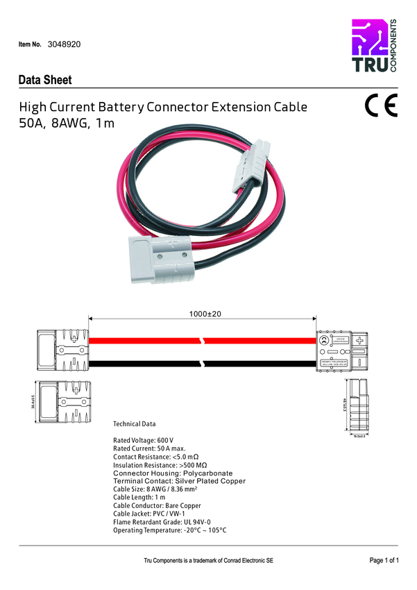Przewód przedłużający złącze akumulatorowe wysokoprądowe 1000 mm TC-12195680 czarny, czerwony TRU COMPONENTS Zawartość: