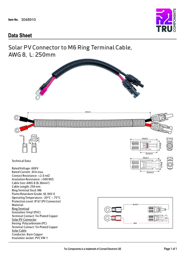 TC-12195640 Złącze solarne do zacisku pierścieniowego M6 długość kabla 250 mm TC-121956...
