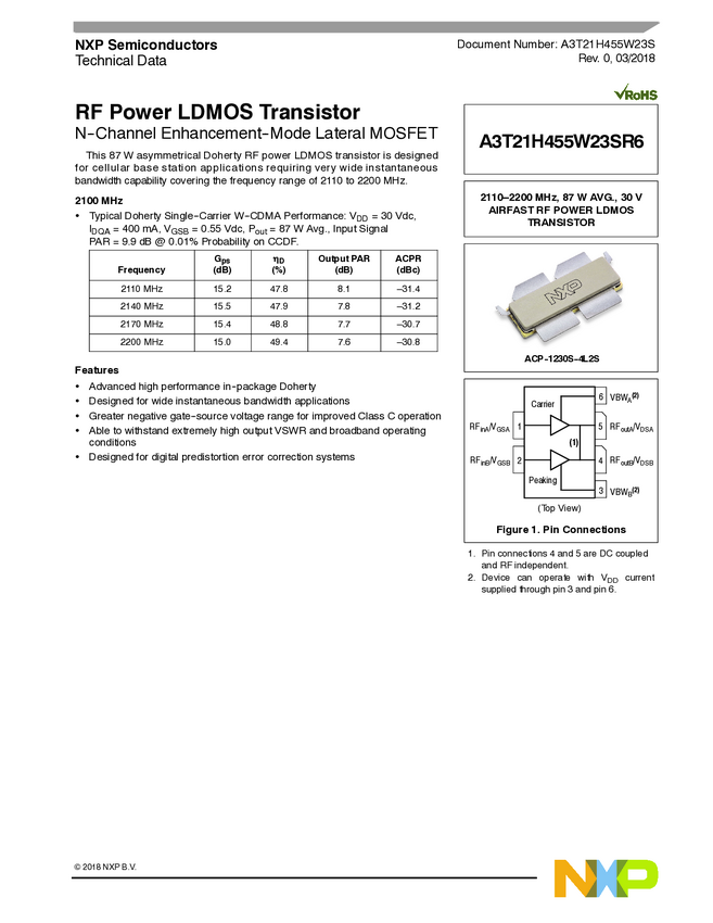 A3T21H455W23S Airfast RF Power LDMOS Transistor, 2110-2200 MHz, 87 W Avg., 30 V