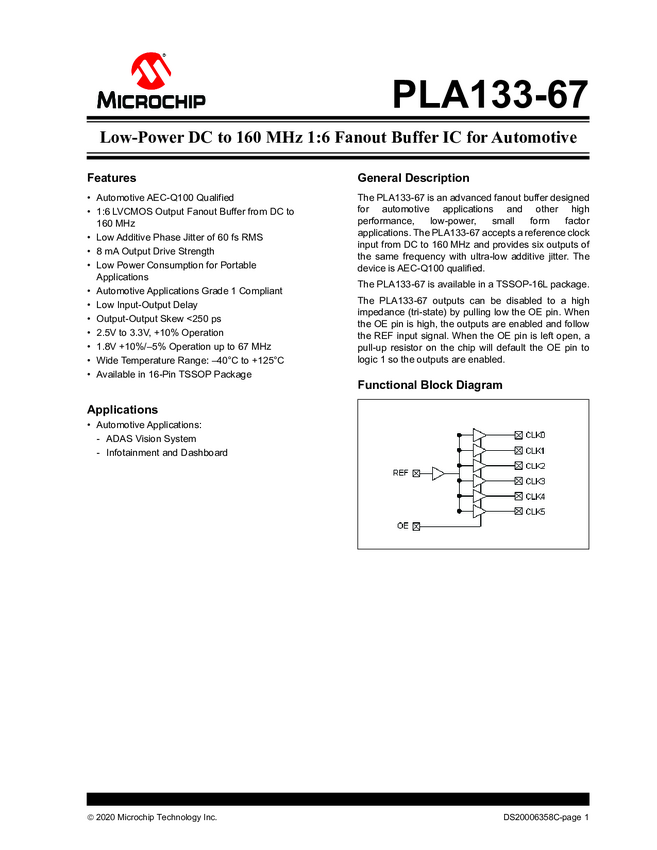 PLA133-67 Low-Power DC to 160 MHz 1:6 Fanout Buffer IC for Automotive