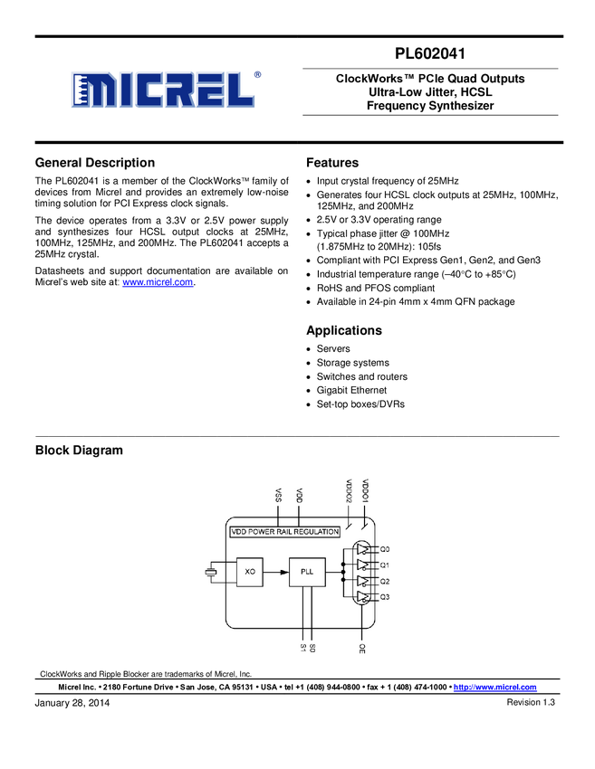 PL602041 ClockWorks PCIe Quad Outputs Ultra-Low Jitter, HCSL Frequency Synthesizer