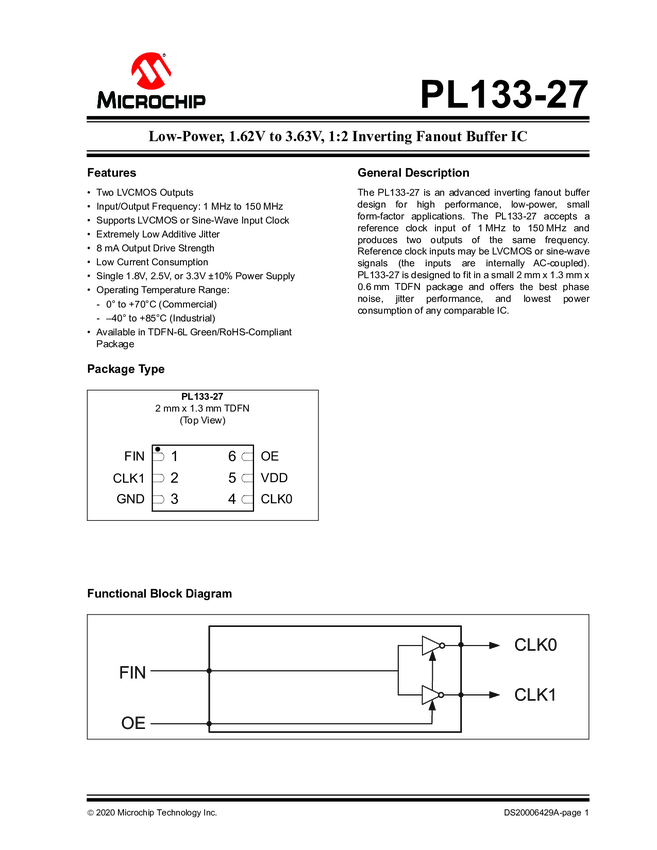 PL133-27 - Low Power, 1.62V to 3.63V, 1MHz to 150MHz, 1:2 Fanout Buffer IC