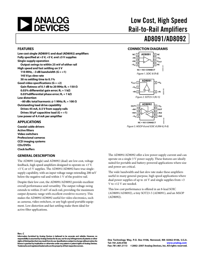 AD8091 AD8092: Low Cost, High Speed Rail-to-Rail Amplifier (Dual)