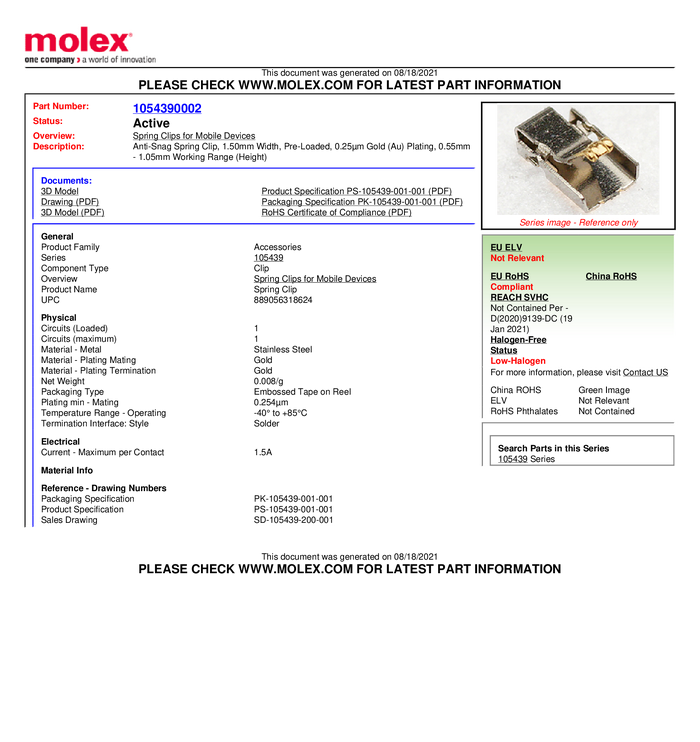 Molex 1054390002 Tuleja trzymająca, piny: 1, 1.5 A, 1 szt.