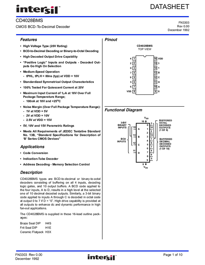 CD4028BKMSR CMOS BCD-To-Decimal Decoder