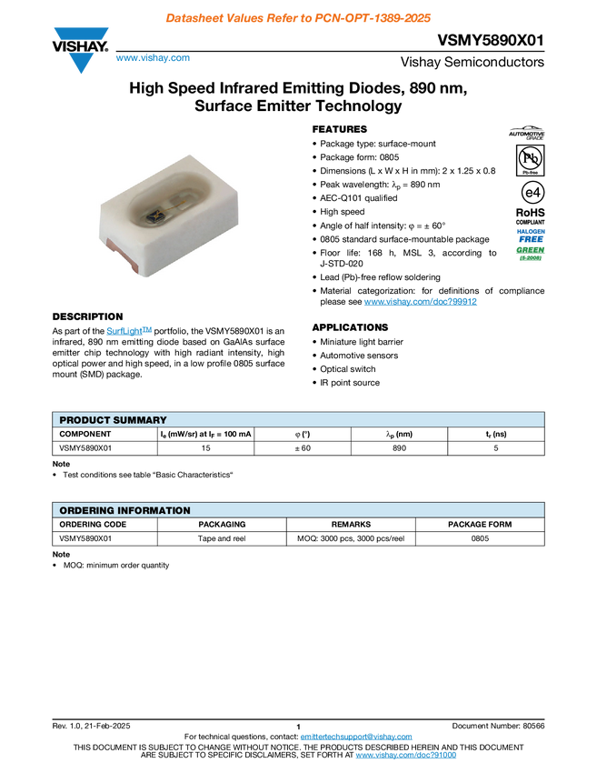 VSMY5890X01 High Speed Infrared Emitting Diodes, 890 nm, Surface Emitter Technology