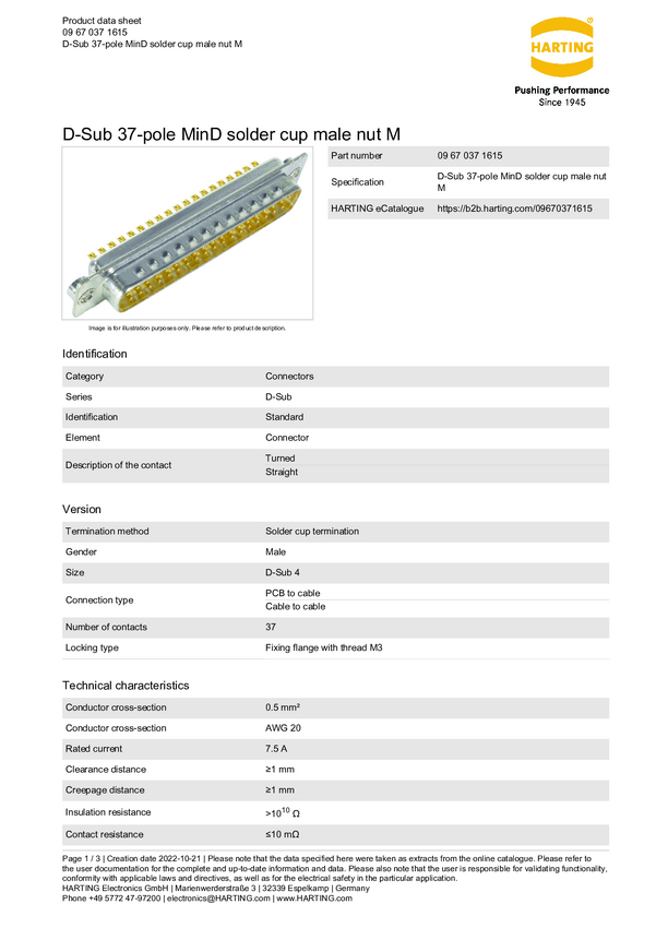 Harting 09 67 037 1615 09670371615 Złącze męskie Ilość styków: 37 kielich lutowniczy 1 szt.