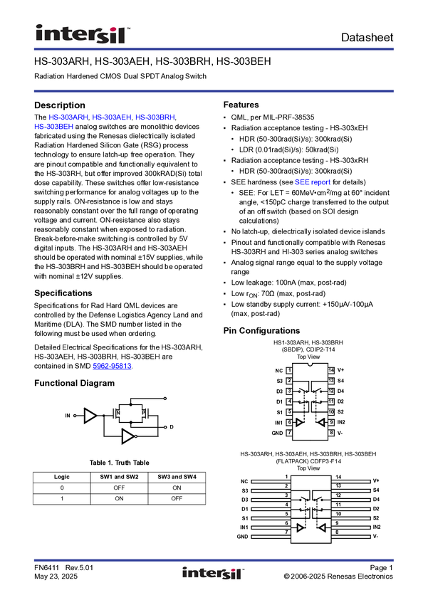 HS0-303ARH-Q Radiation Hardened CMOS Dual SPDT Analog Switch