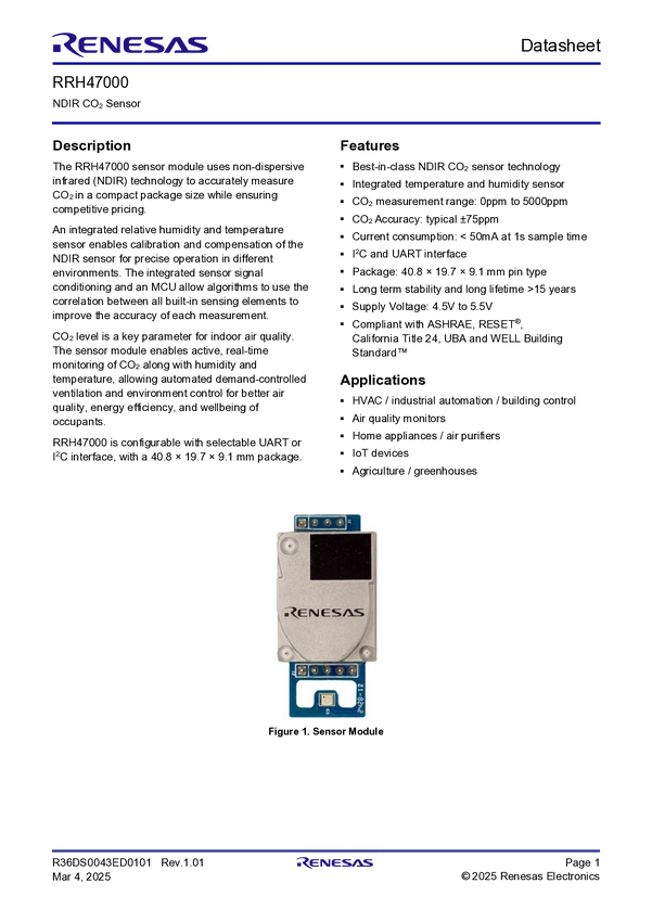 RRH47000 Single-Channel NDIR CO2 Module with Humidity and Temperature Sensor