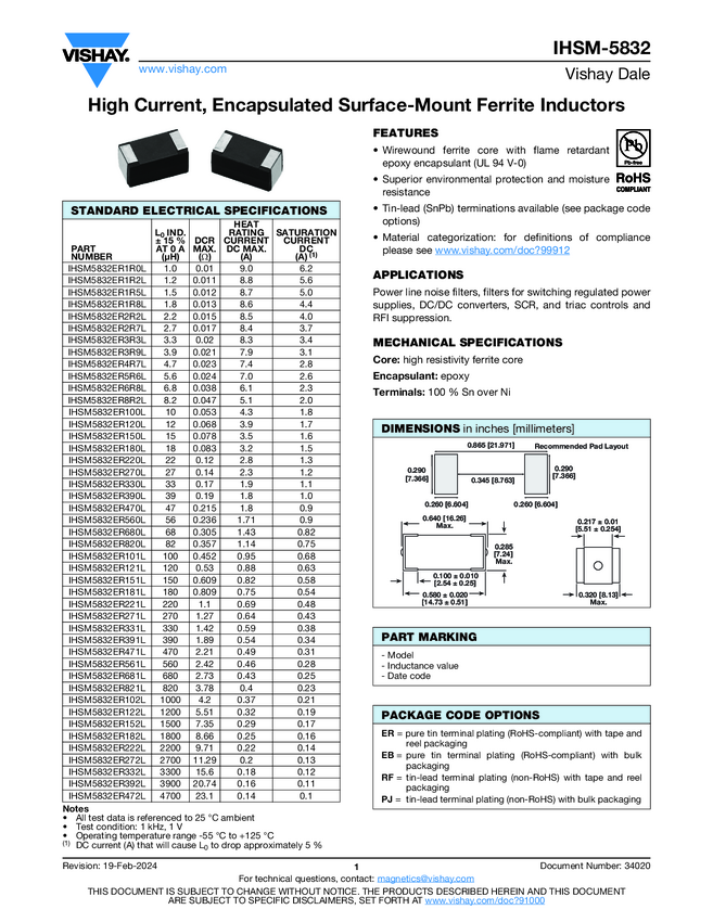 IHSM-5832 High Current, Encapsulated Surface-Mount Ferrite Inductors