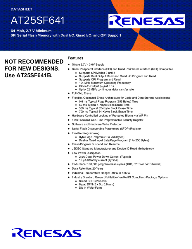AT25SF641 64Mbit, 2.7V Minimum SPI Serial Flash Memory with Dual I/O Support
