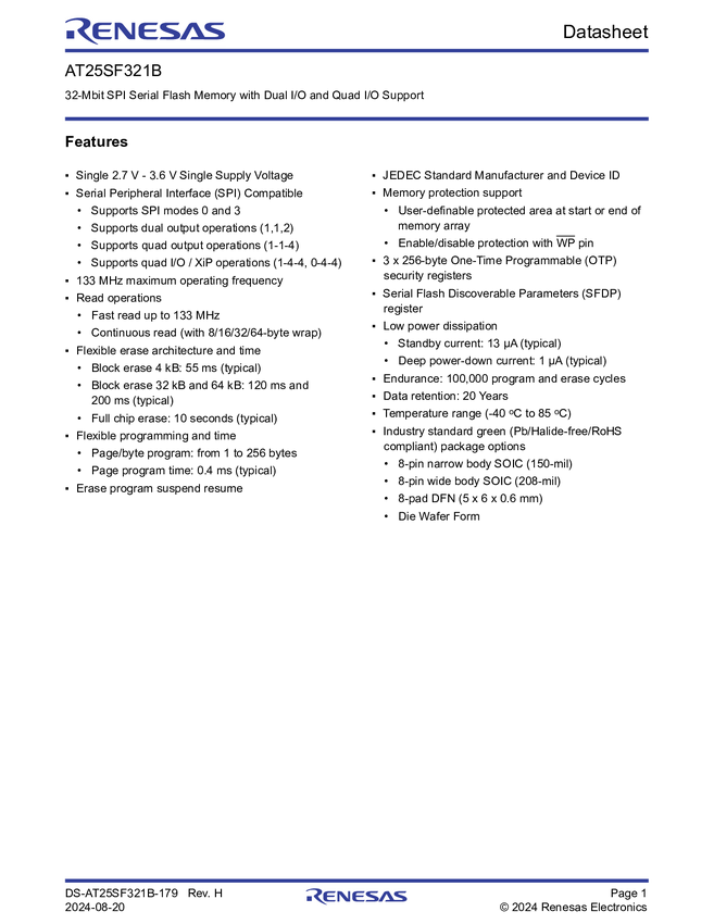 AT25SF321B 32Mbit, 2.7V Minimum SPI Serial Flash Memory with Dual I/O Support